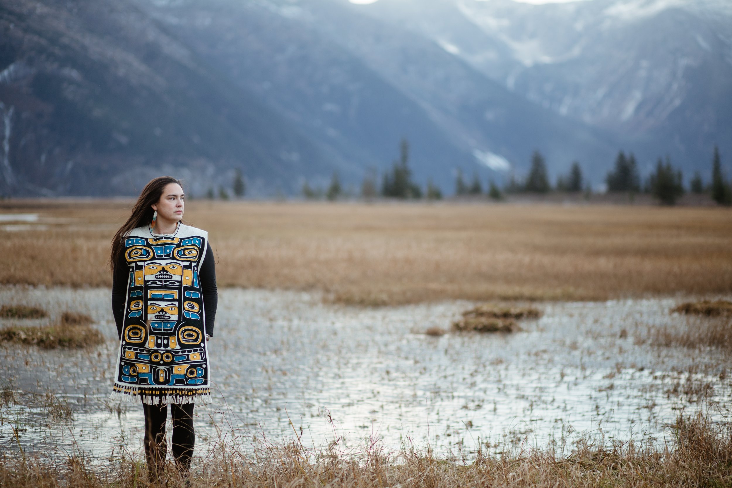 Chilkat (naaxiin) weaving is a textile tradition that involves finger-twinning on an upright wooden frame. This style of weaving has been passed down through Tlingit, Haida and Tsimishian communities in Alaska and in Canada. The process of making a Chilkat weaving begins with gathering and processing materials. The warp is customarily made from thigh-spun mountain goat wool combined with wet cedar bark, while the weft uses mountain goat or merino wool. With the Chilkat technique, a weaver can work with small sections of a pattern, instead of moving horizontally across the weaving. This allows for making curvilinear patterns, and even circles. Chilkat designs are used to make ceremonial robes, tunics. In recent years, weavers have also made face masks and earrings.